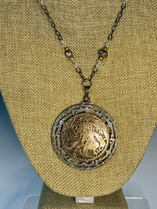 VINTAGE AZTEC STERLING SILVER AND COPPER PENDANT WITH HANDMADE CHAIN LCN912