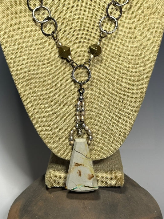 HEMATITE, BRASS, STERLING SILVER ROYSTON TURQUOISE FOCAL PENDANT STATEMENT NECKLACE LCN881