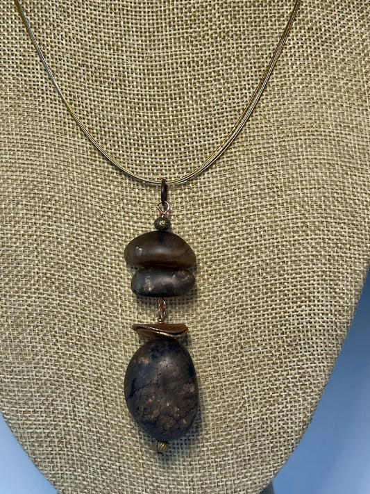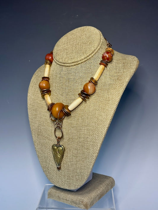 CARVED WOOD, AGATE, COPPER AND BRASS HEART STATEMENT NECKLACE LCN893