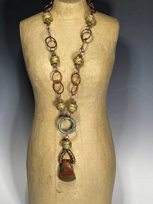 TORCHED COPPER, BRASS AND RED CREEK JASPER STATEMENT NECKLACE LCN880
