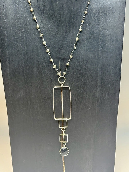 STERLING SILVER RECTANGLE/CIRCLE/ONYX NECKLACE WITH PYRITE CHAIN LCN669
