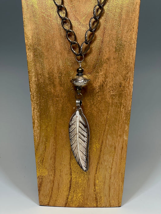 LEATHER AND BRASS CARVED FEATHER NECKLACE LCN591