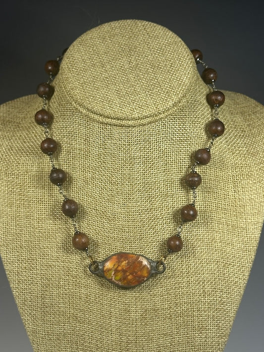 AGATE FOCAL PENDANT WITH WOOD PRAYER BEAD NECKLACE LCN1023