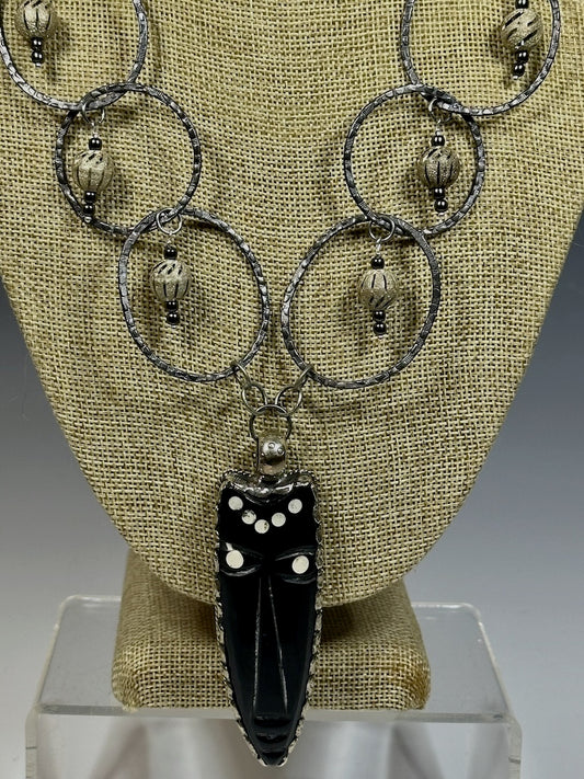 STERLING SILVER AND BLACK BONE MASK PENDANT WITH HEMATITE CIRCLE CHAIN AND SILVER BEADS LCN1013