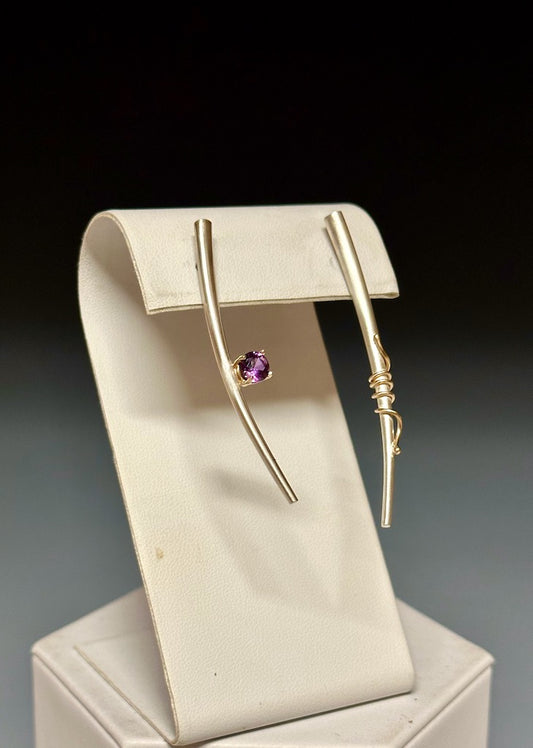 Asymmetrical Sterling Silver Tube Earrings with Amethyst and 14k wrap MB174E