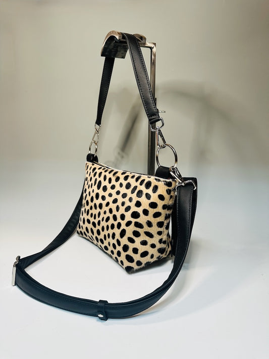 LEATHER SPOTTED HIDE ZIP TOP SHOULDER BAG WITH SUEDE TASSEL NH169