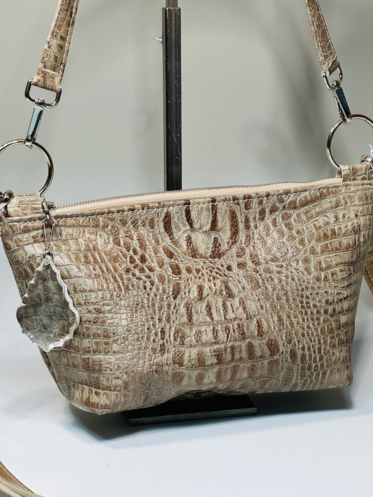 TAUPE EMBOSSED LEATHER ZIP TOP SHOULDER BAG NH170