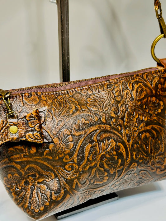 BROWN EMBOSSED LEATHER ZIP TOP SHOULDER BAG, COWBOY NH171