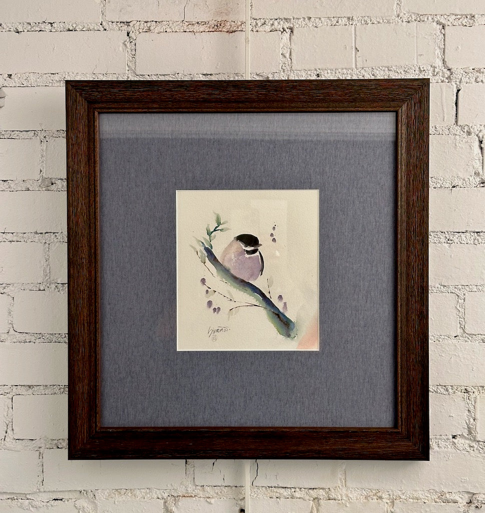 "ASKIAN BLACK CAPPED CHICKADEE WITH BLUE MAT" Original Watercolor/Framed