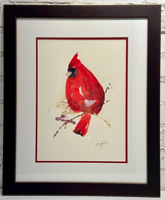 "SINGLE CARDINAL WITH RED MAT" Original Watercolor/Framed