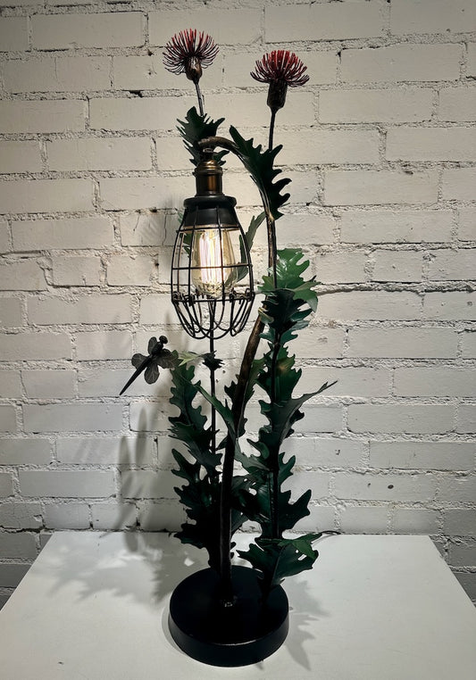 RED THISTLE FIELD STUDY LAMP WITH DRAGON FLY AND OPEN CAGE SHADE