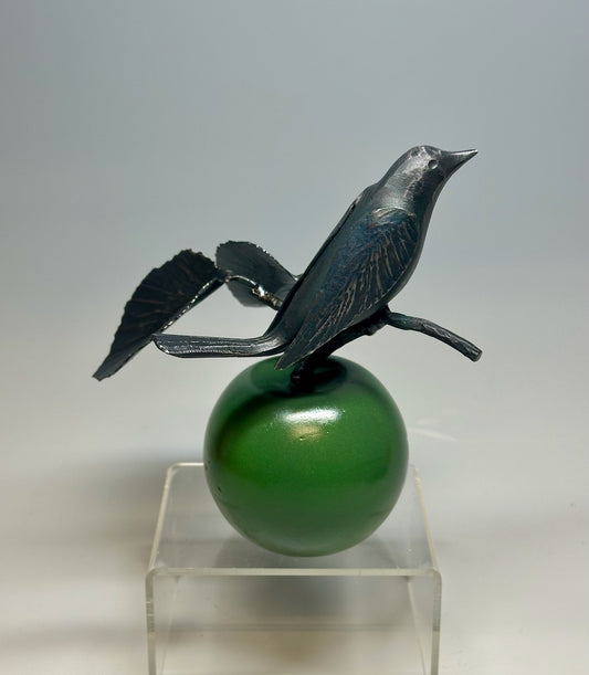 "Small Dark Green Apple and Wren" Hand Forged Metal Sculpture
