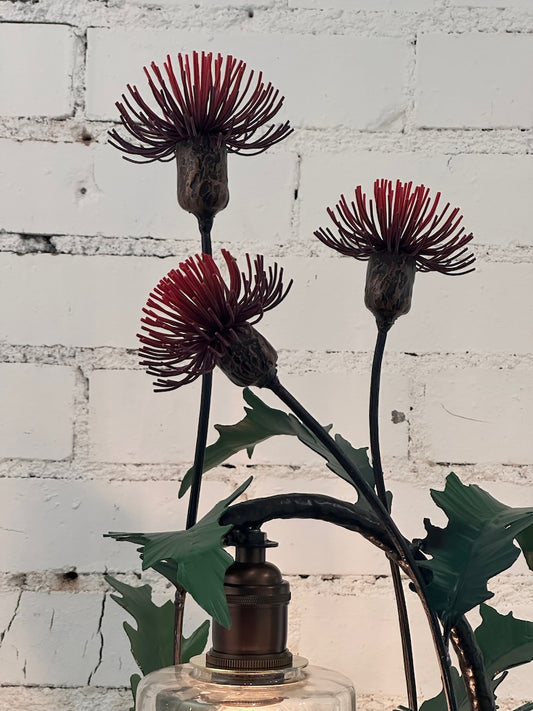 DARK RED BLOOM HAND FORGED LAMP WITH FROSTED SHADE