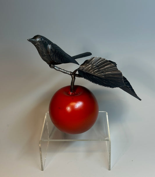 "Small Red Apple and Wren" Hand Forged Metal Sculpture