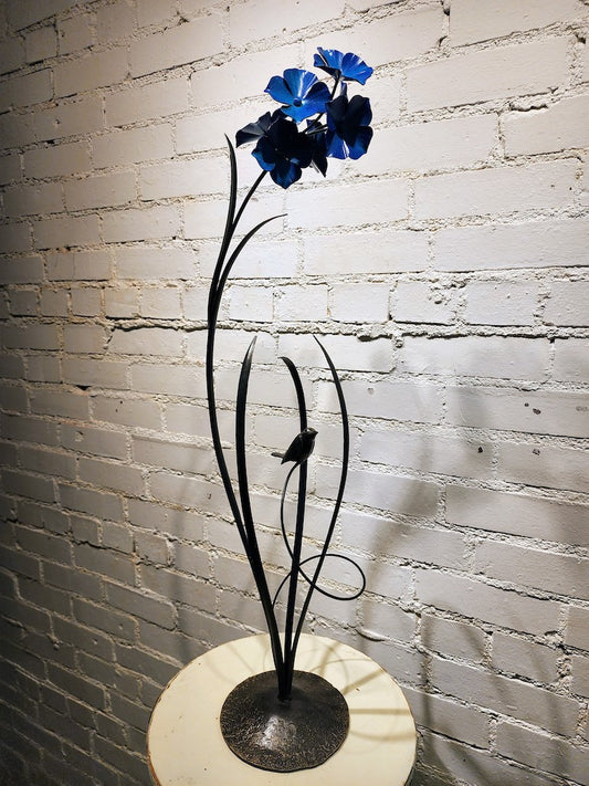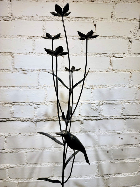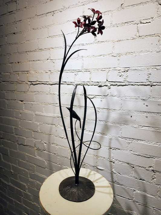 FIELD STUDY WITH DEEP RED FLOWER AND BLACK WREN Hand Forged Metal Sculpture