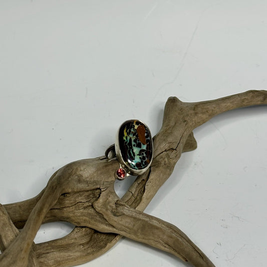 OPALIZED WOOD STERLING SILVER ADJUSTABLE RING WITH SMALL GARNET WK90