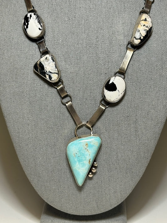 WHITE BUFFALO AND ROYSTON BLUE TURQUOISE AND OXIDIZED STERLING SILVER NECKLACE WK57