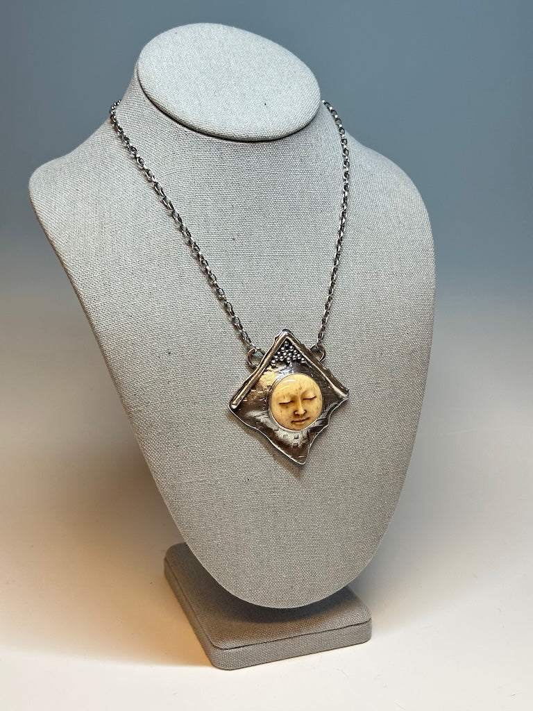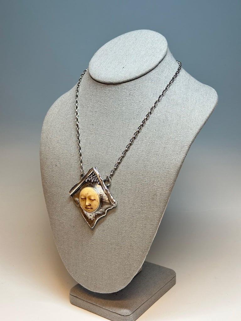 .925 SILVER WITH CARVED BUFFALO BONE MOON FACE PENDANT NECKLACE BR407