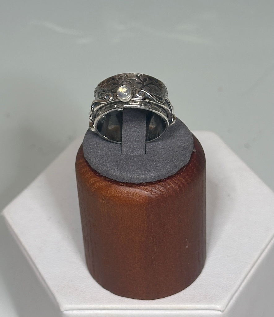 .925 TEXTURED TWIDDLE RING WITH AQUAMARINE, CLEAR MOONSTONE AND BLUE TOPAZ BR488