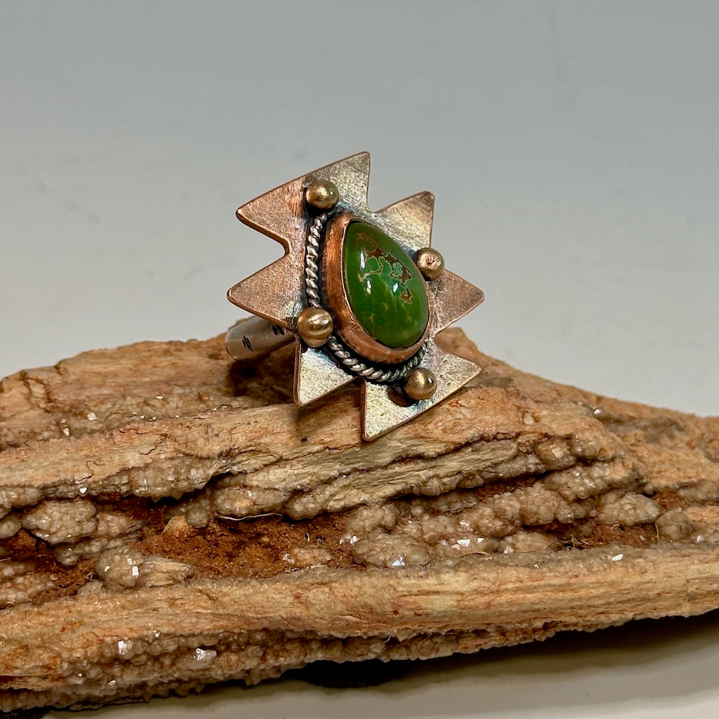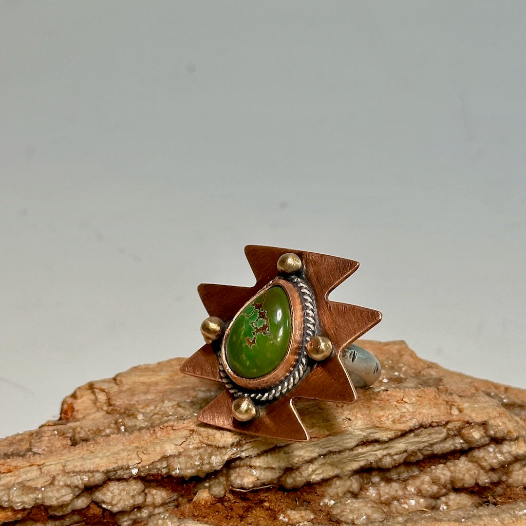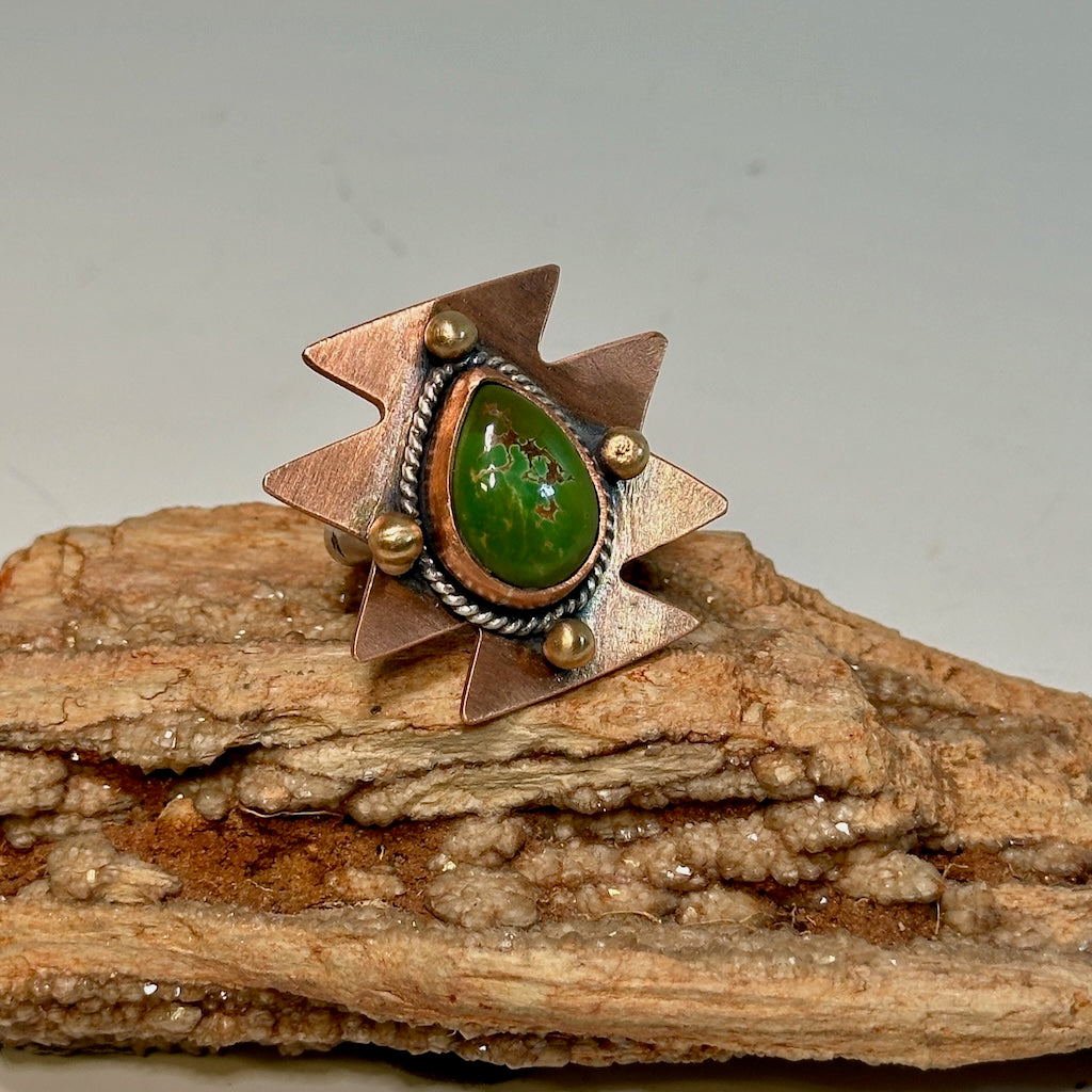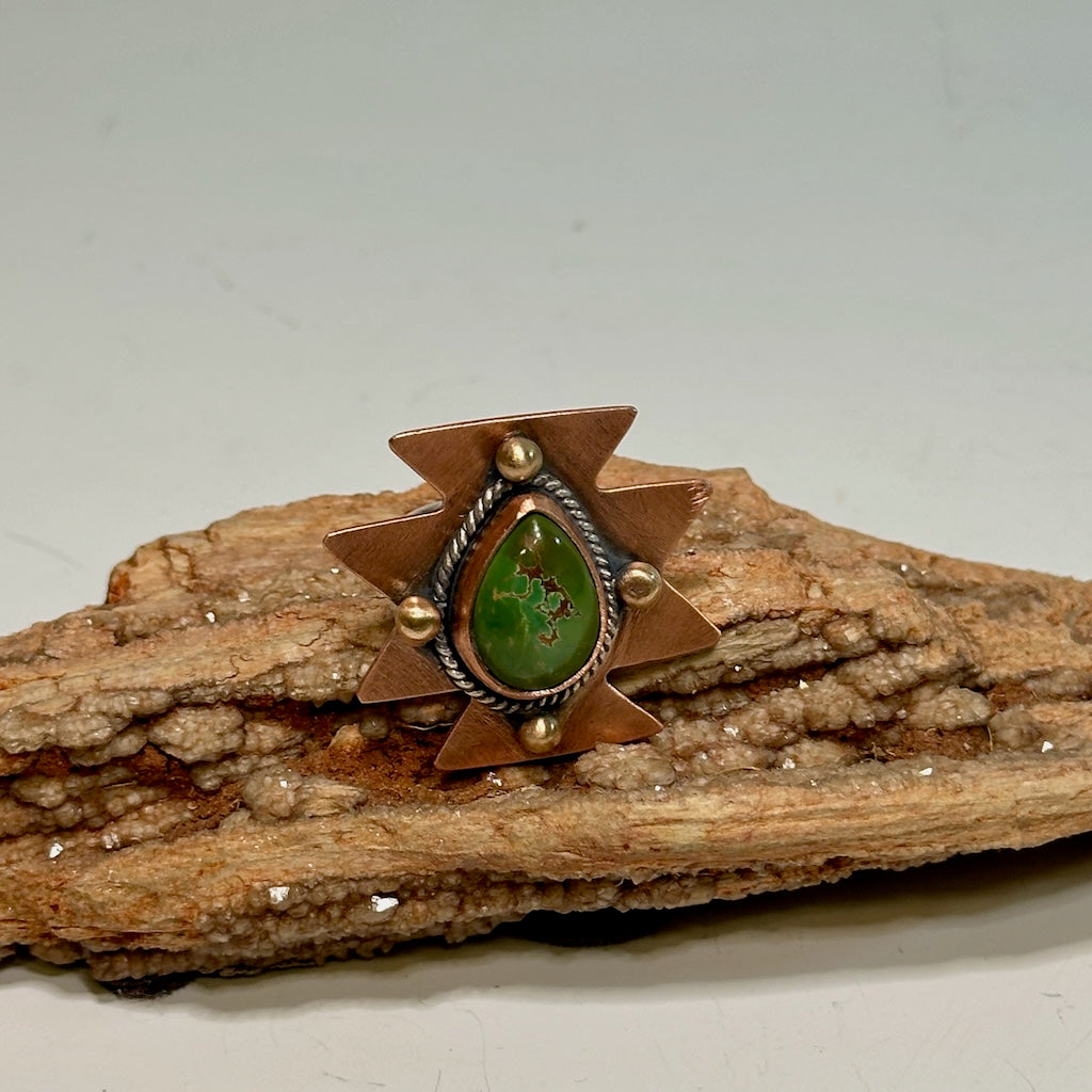 High grade Royston tuquoise set in copper with sterling silver rope detail and brass bead accents. Hand forged and stamped sterling silver band.