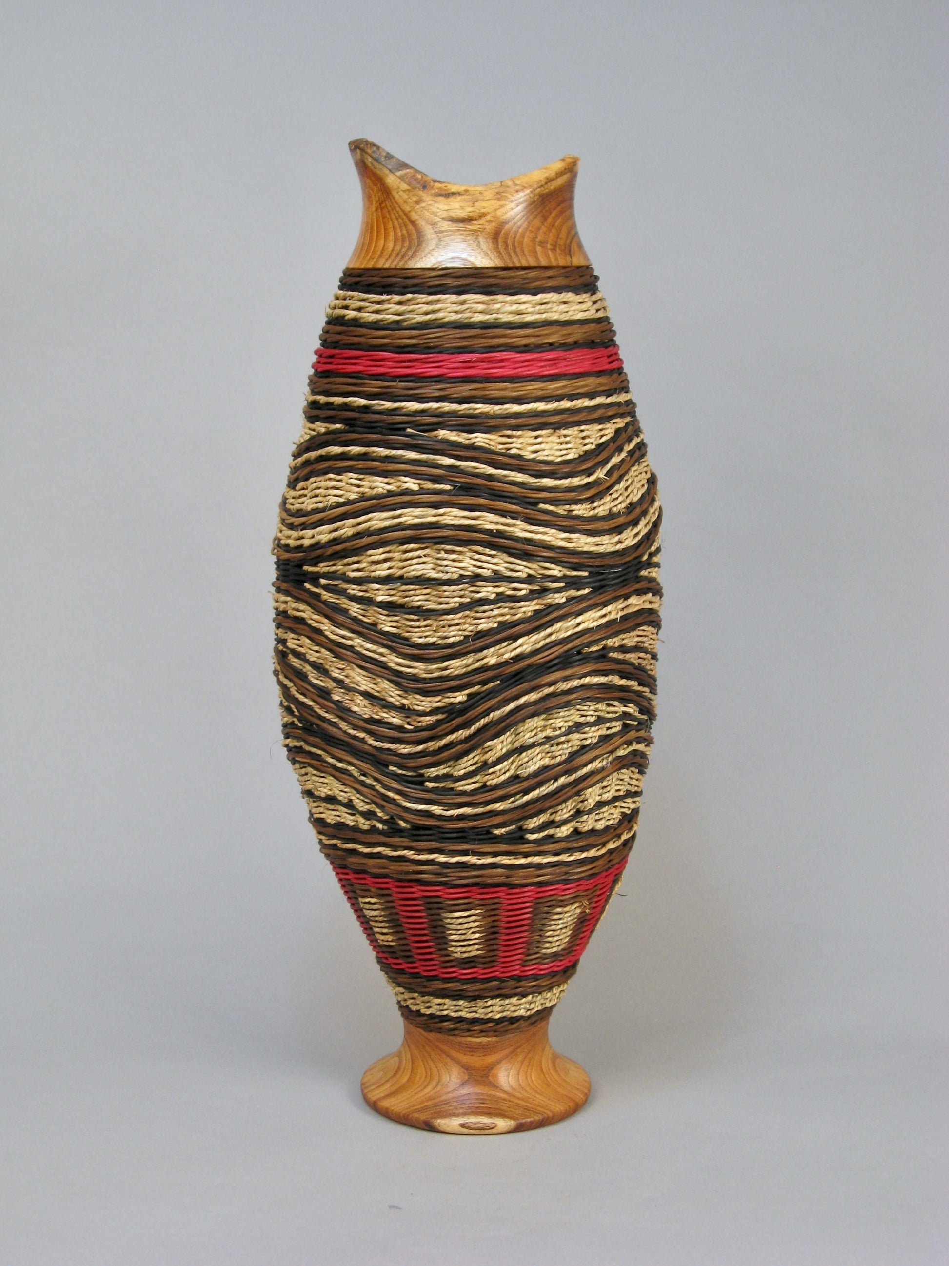 The work is wicker-weave basketry of dyed rattan and seagrass cord, and lathe turned wood bases, rings and rims. Each piece is a one-of-a-kind handmade original. Even when I make a second piece with the same construction, they are never quite alike. Especially, the wooden elements have all the variety that nature provides.