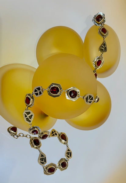 A truly exceptional piece of wearable art. Hollow form sterling silver with faceted Garnets set in sterling silver.