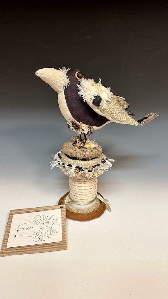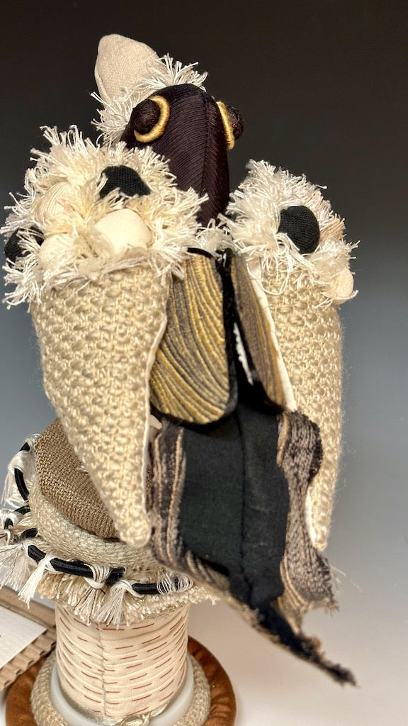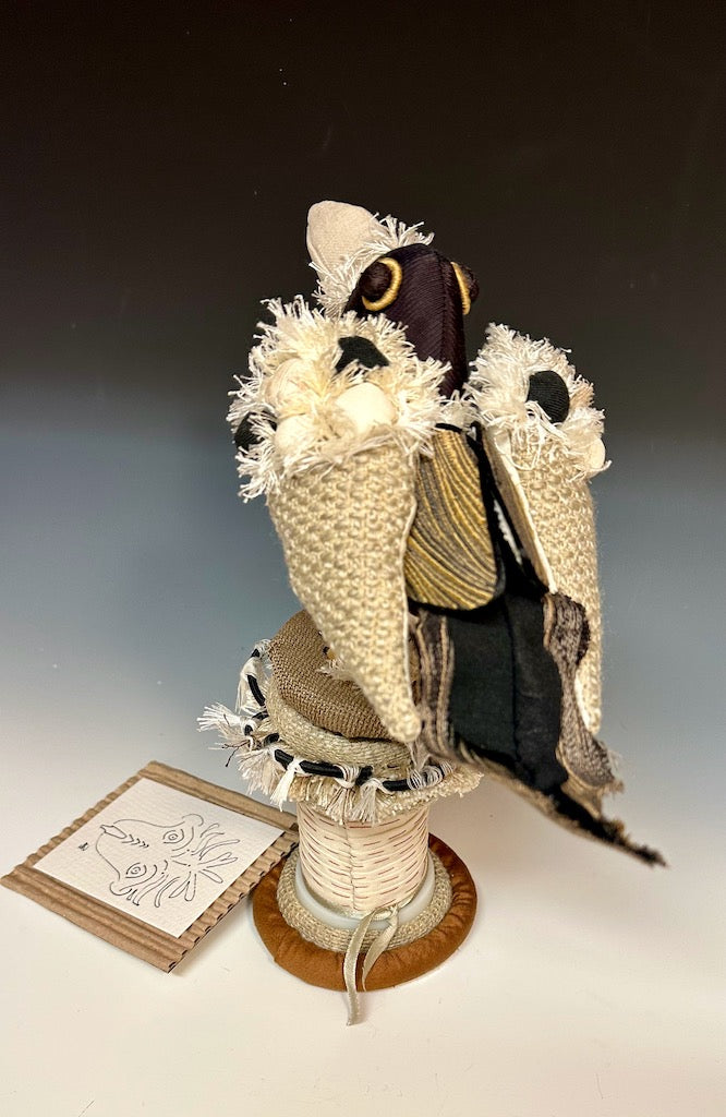 Debra always has a deliberate message behind her creative projects. I love her mission to acknowledge women of accomplishment in the form of birds. From fabric, shapes and fringe detail to beads and leg materials all are selected with relevance depicting the women they represent. These selections define their purpose, personalities and accomplishments.