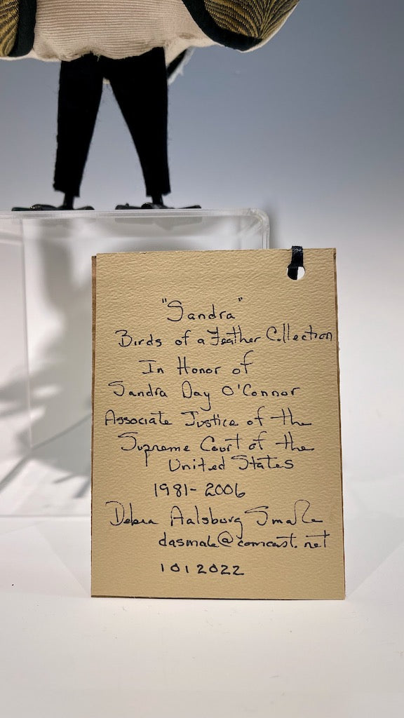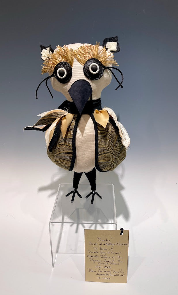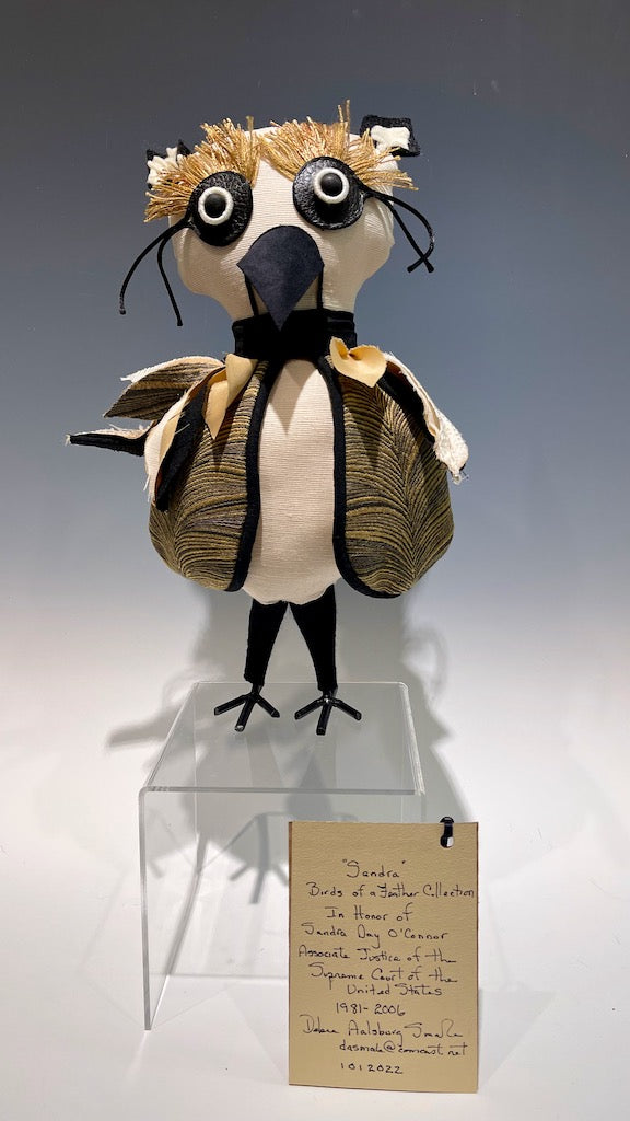 Debra always has a deliberate message behind her creative projects. I love her mission to acknowledge women of accomplishment in the form of birds. From fabric, shapes and fringe detail to beads and leg materials all are selected with relevance depicting the women they represent. These selections define their purpose, personalities and accomplishments.