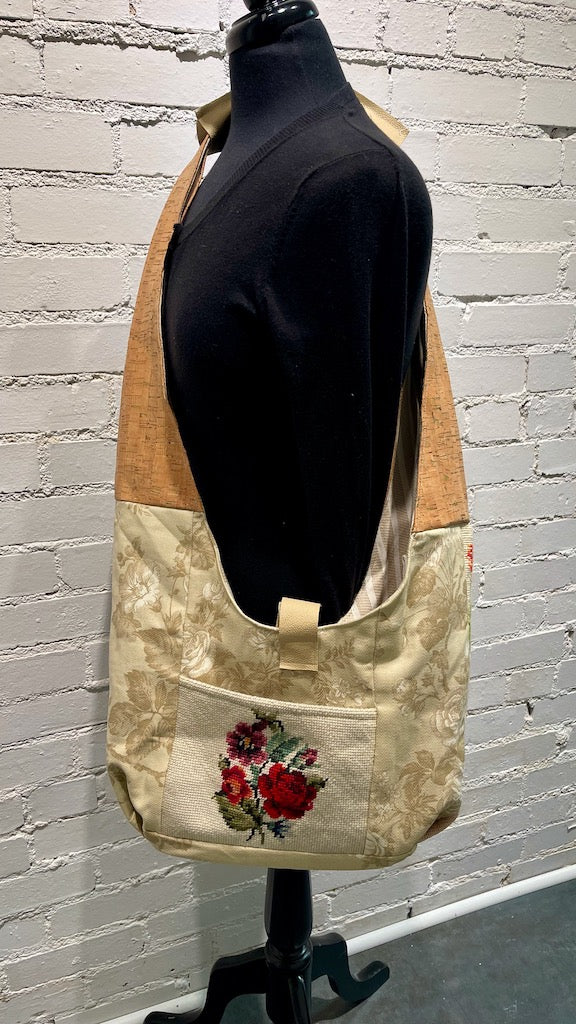 This handbag has been handcrafted using vintage tapestries and fabric which create a fine wearable art crossbody bag. Inner zipper pocket for convenience. Each one is one of a kind. Soft deer suede on top of strap for incredible comfort along with a detachable handmade fabric flower pin.