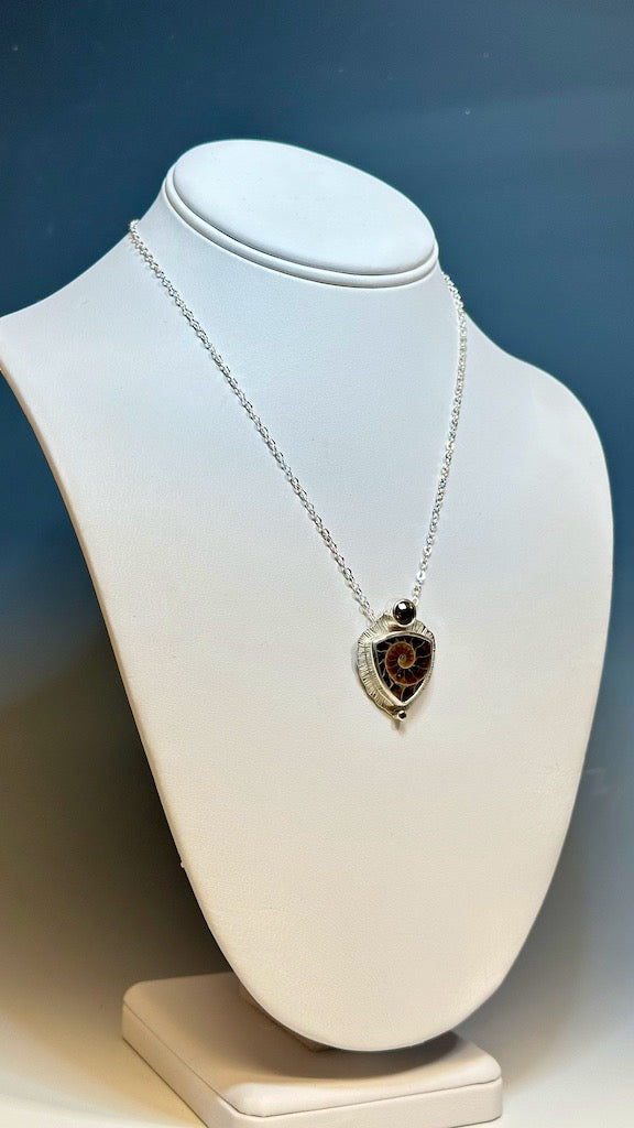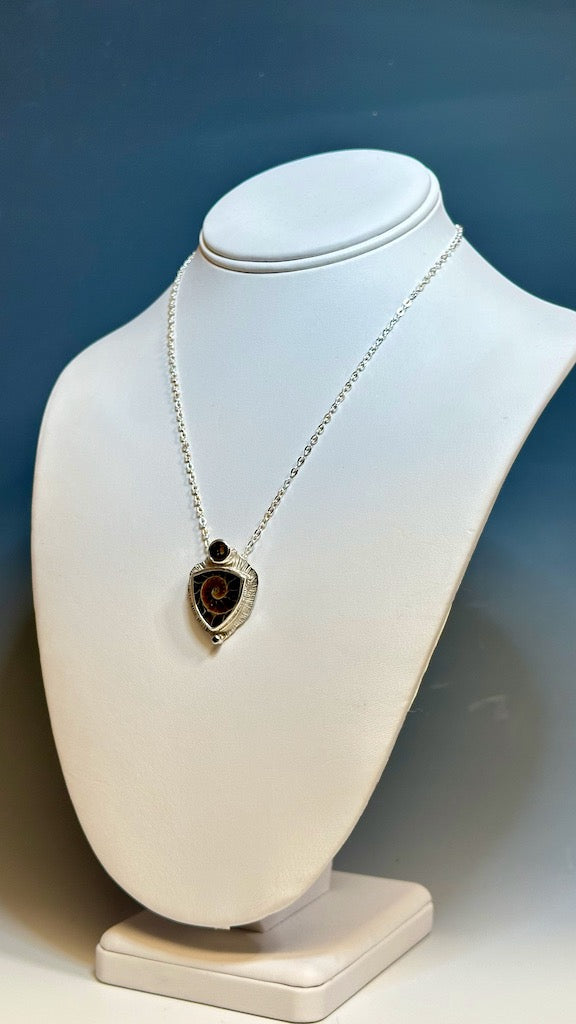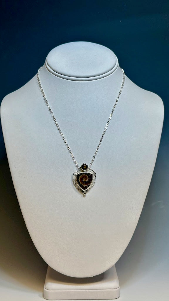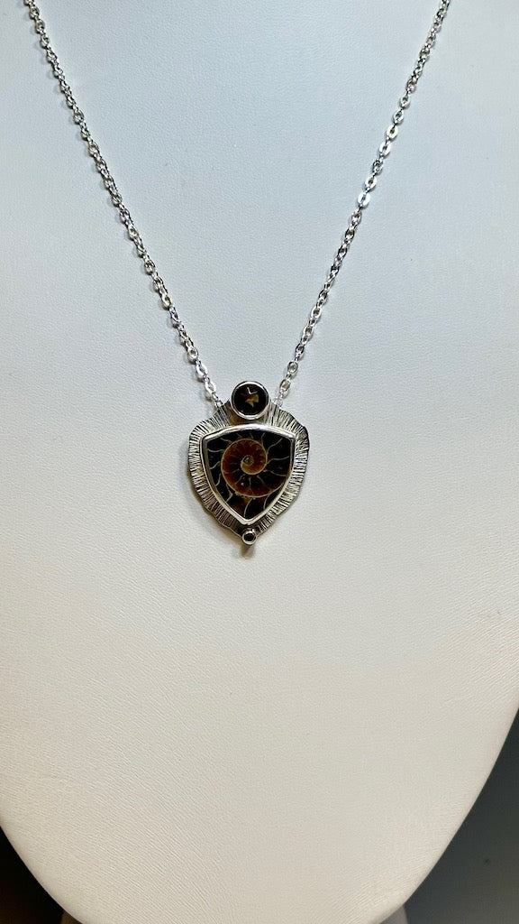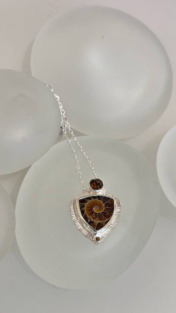 AMMONITE, WHISKEY QUARTZ AND SAPPHIRE STERLING SILVER NECKLACE - NM510N