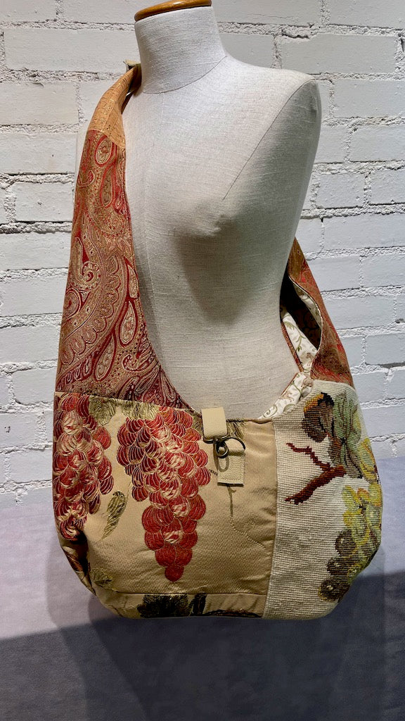 This handbag has been handcrafted using vintage tapestries and fabric which create a fine wearable art crossbody bag. Inner zipper pocket for convenience. Each one is one of a kind. Soft deer suede on top of strap for incredible comfort along with a detachable handmade fabric flower pin.