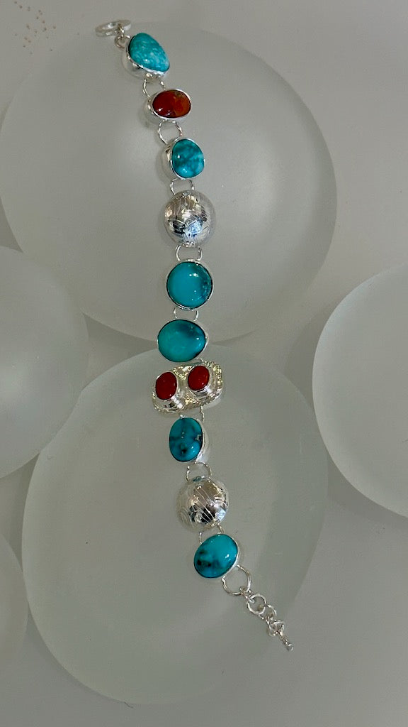 TURQUOISE AND VINTAGE ITALIAN CORAL STERLING SILVER BRACELET NM505B