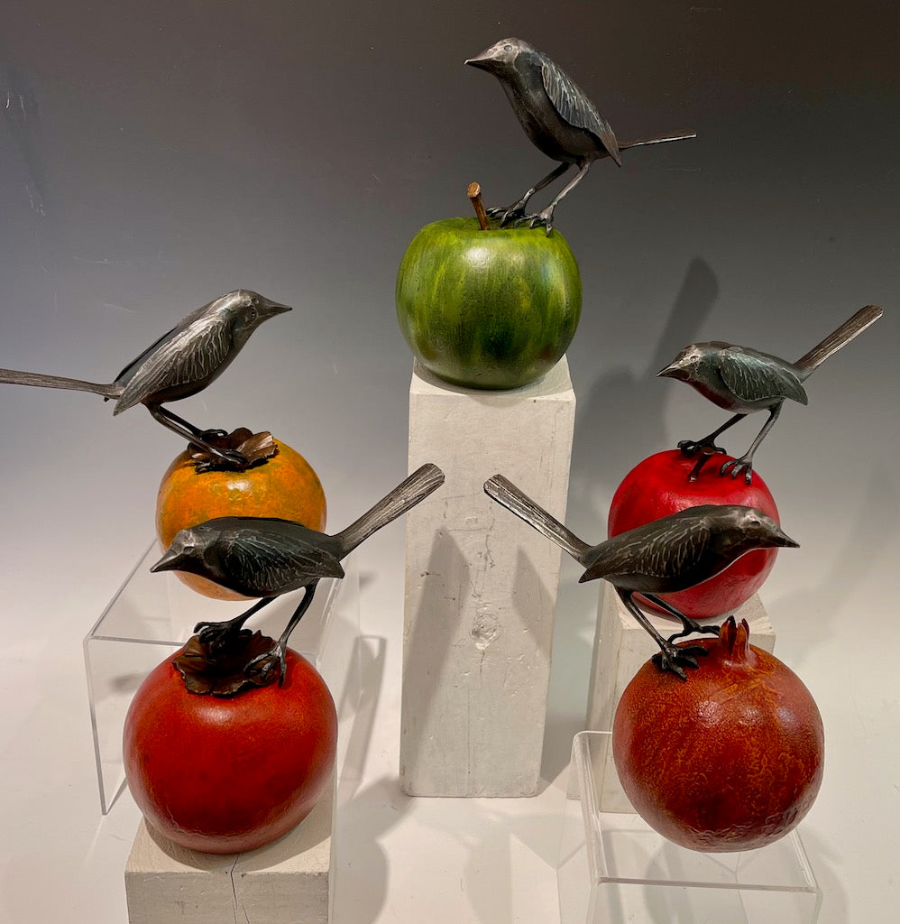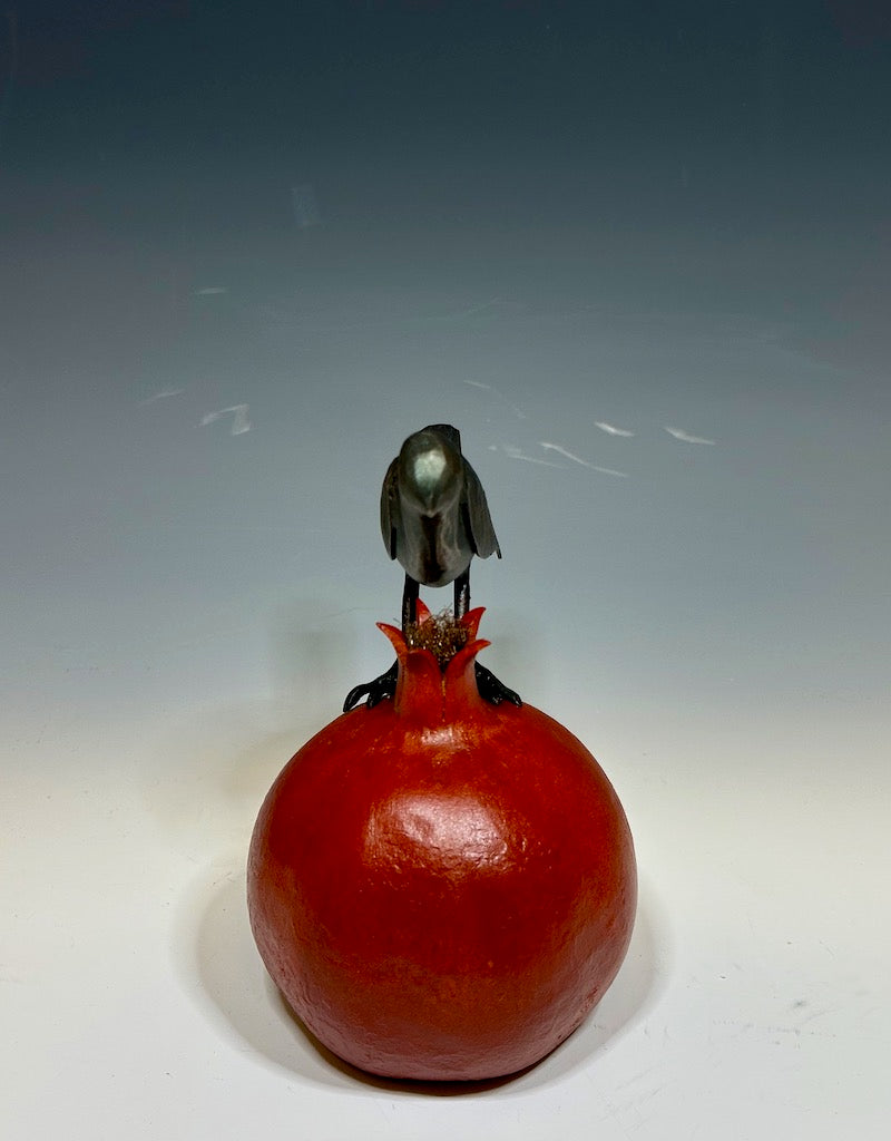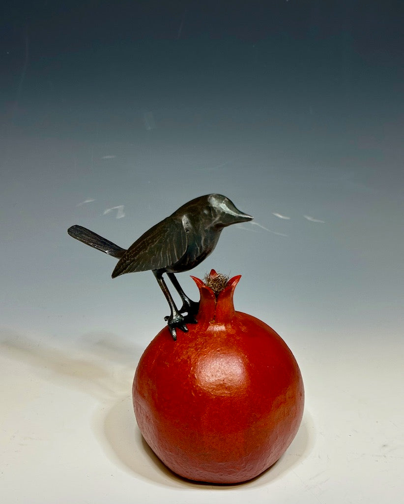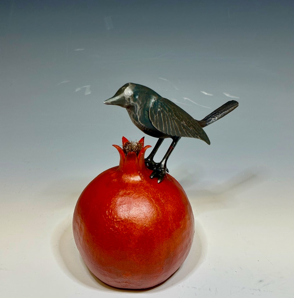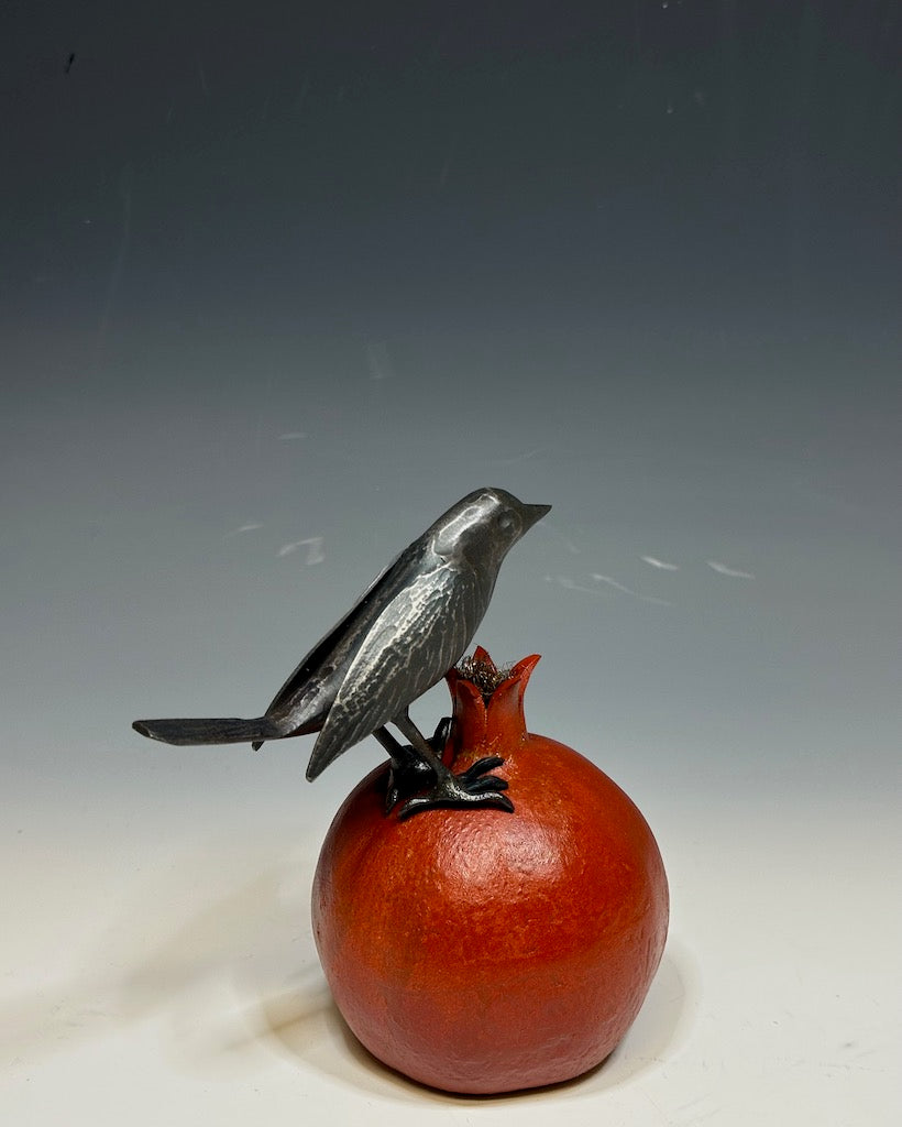 "Red Pomegranate and Wren" Hand Forged Metal Sculpture
