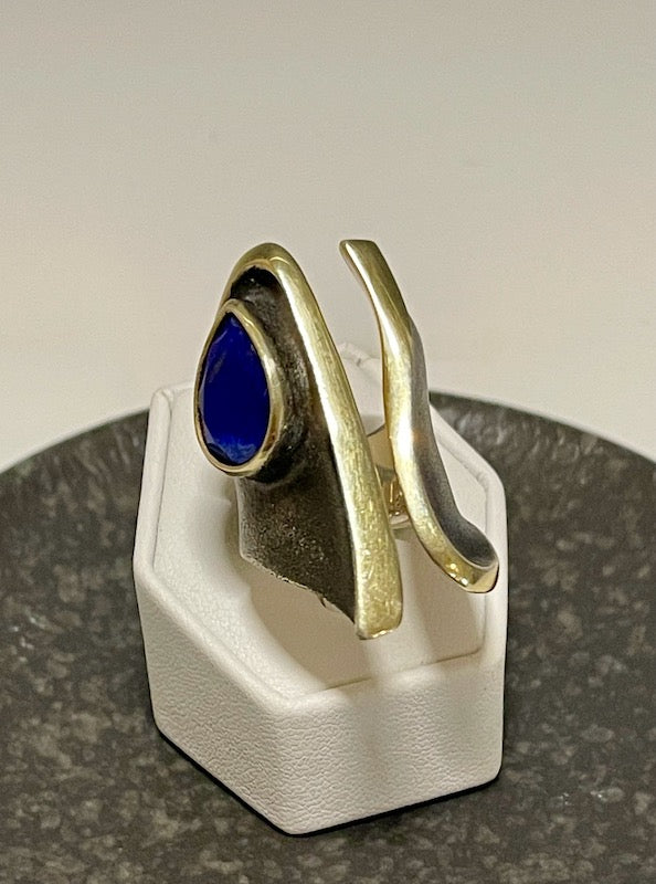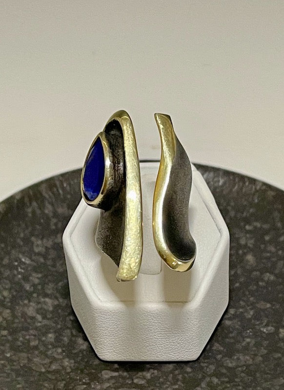OXIDIZED STERLING SILVER AND 14K LARGE OPEN WRAP RING WITH LAPIS BR325275