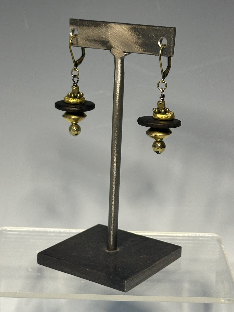 BLACK WOOD AND BRASS DROP EARRINGS LCE588