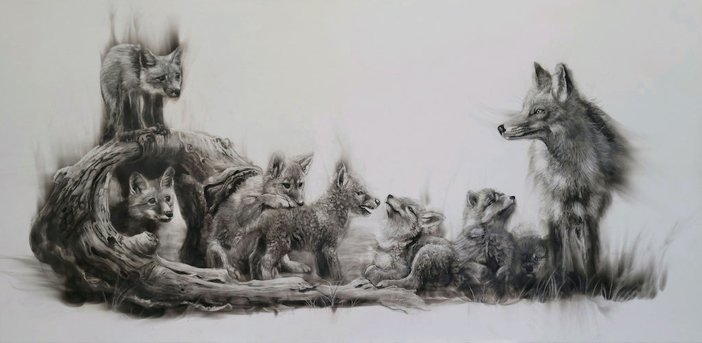"FOX TALES" Original Fumage Drawing on Birch Panel/Framed