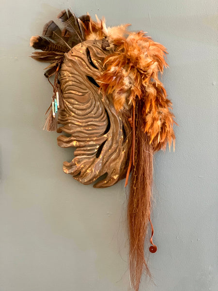 Micaceous Clay/Mixed Media/Wall Sculpture. This piece is part of series Lucy likes to call her Spirit Masks. Each is individual to a sense, vision or theme that comes to the surface through dreams and waking forms of meditation.