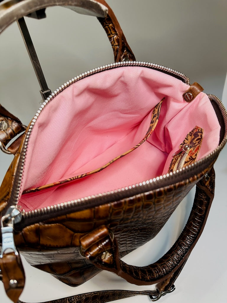 FIONA EMBOSSED BROWN LEATHER HANDBAG WITH ROLLED HANDLES NH172