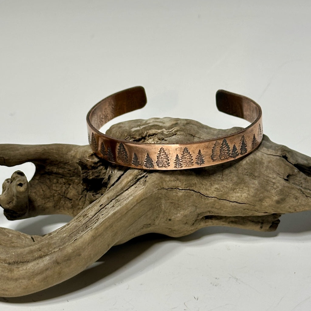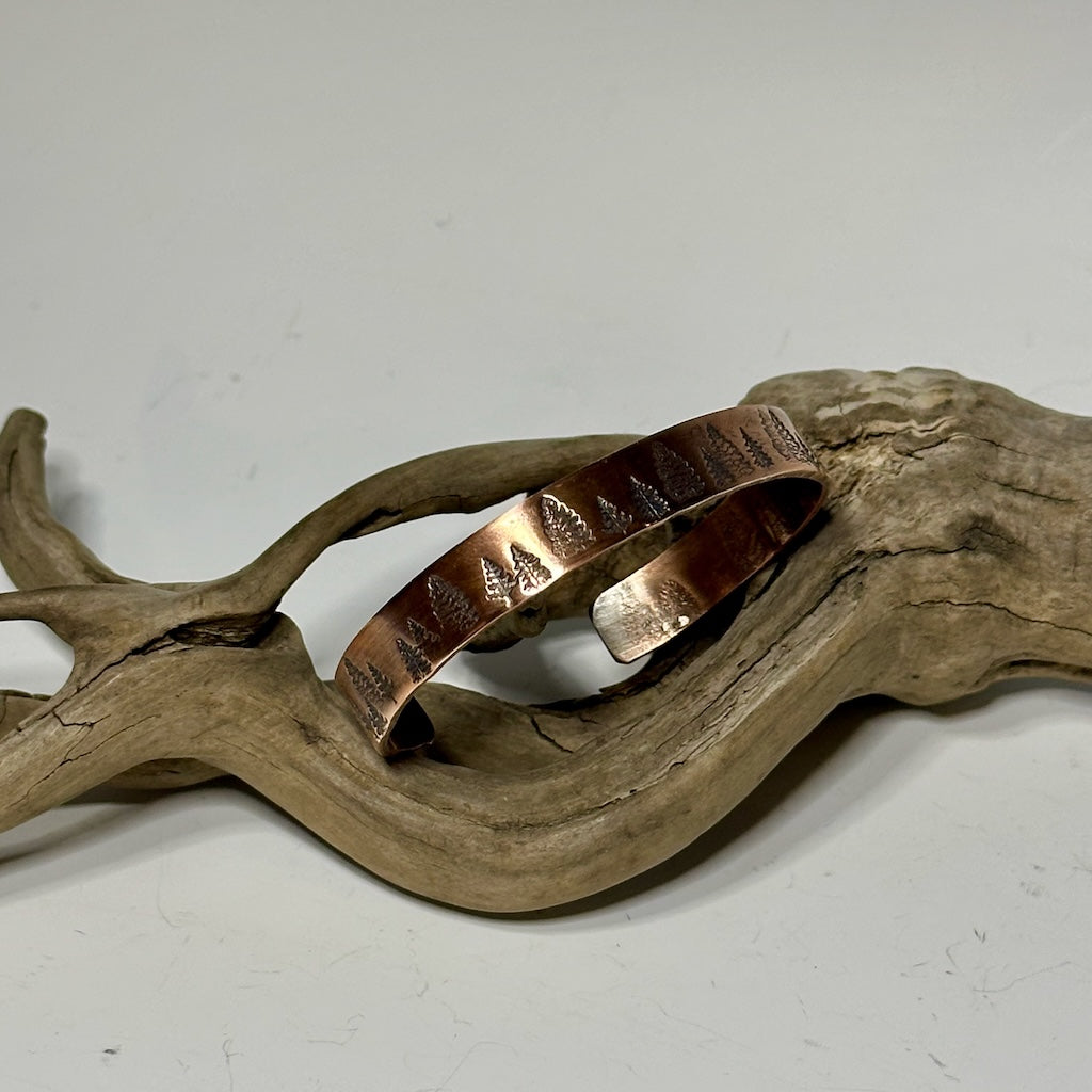 Hand forged, heavy gauge copper cuff. Hand stamped with evergreen trees.