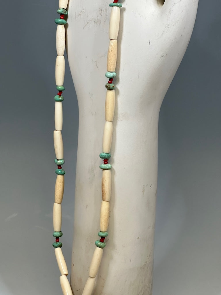Vintage buffalo bone beads, rare vintage green turquoise beads and red crow beads. Elk leather lace.