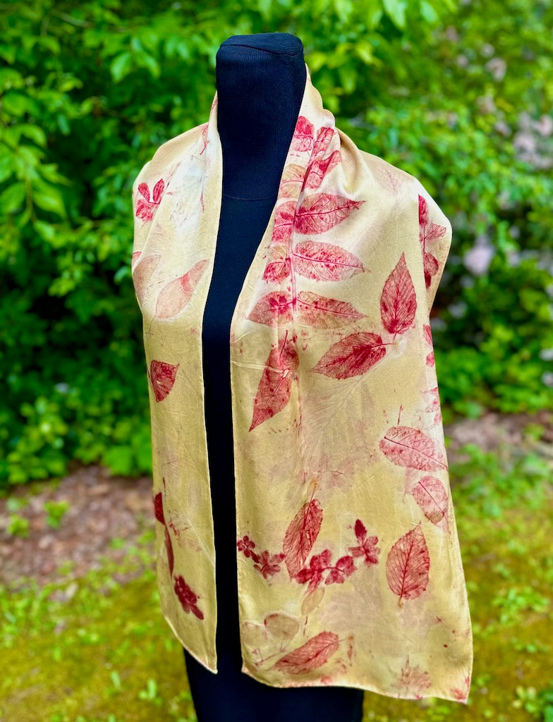 HAND DYED 100% CHARMEUSE ECO-PRINTED SCARF WITH MARIGOLD AND MADDER ROOT NATURAL DYES