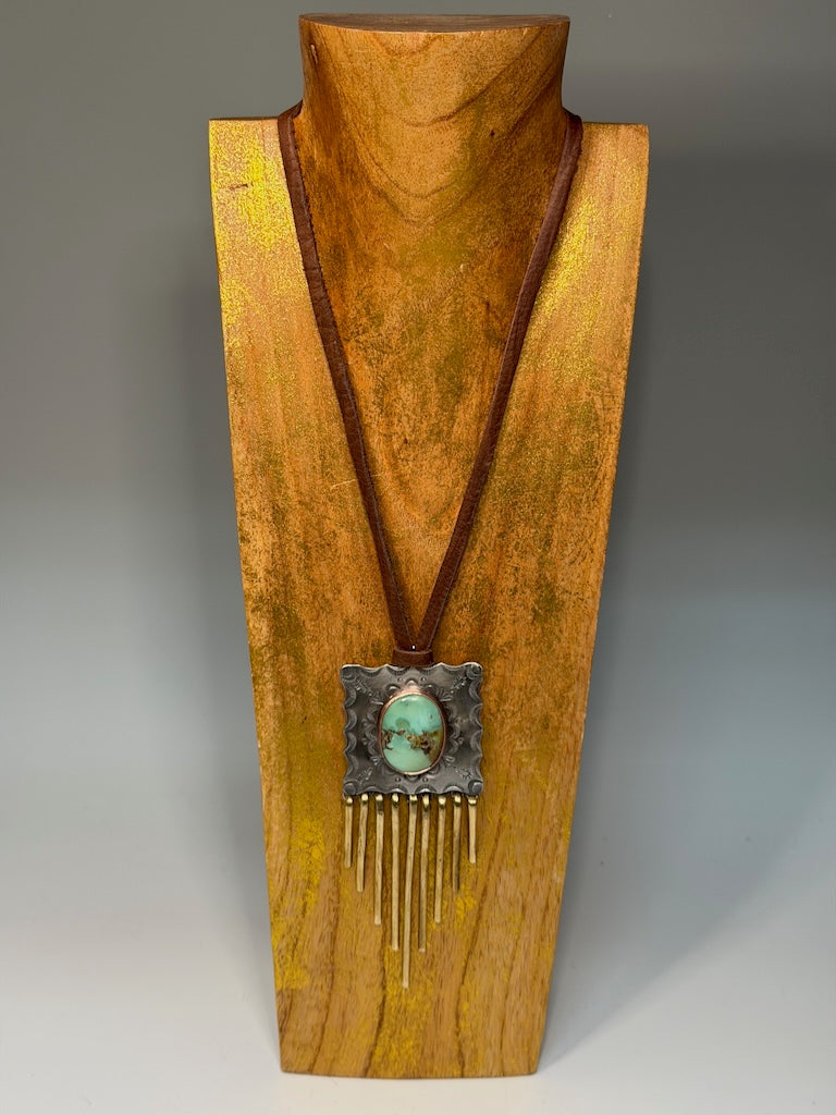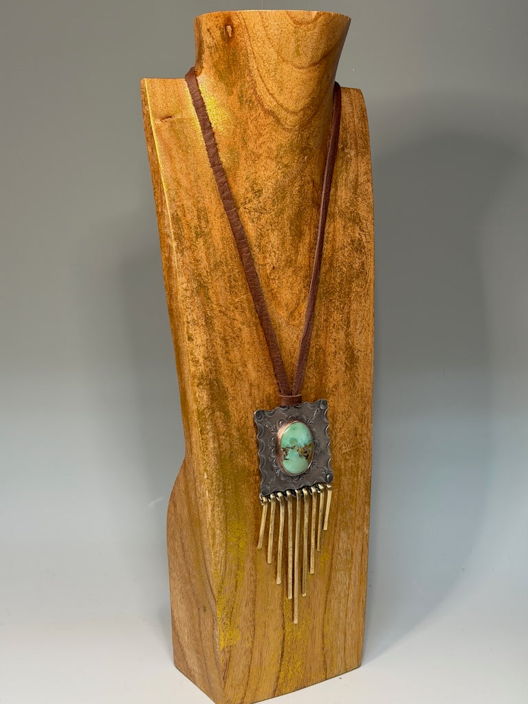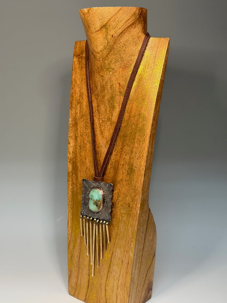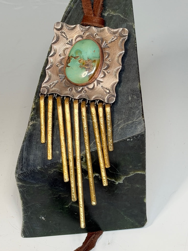 High grade Royston turquoise that has been mined in Nevada. Set in copper on heavy gauge sterling silver. Hand stamped. Hand textured and hand forged brass. Elk leather lace that is adjustable with a sterling silver bead. Antiqued and brushed.