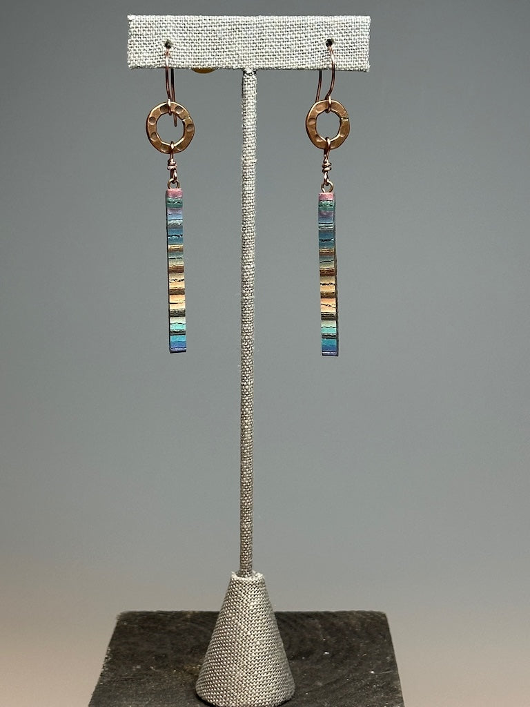 MULTI COLORED DANGLE POLYMER CLAY EARRINGS WITH FIRE TORCHED CIRCLES AND COPPER EAR WIRES PCE779