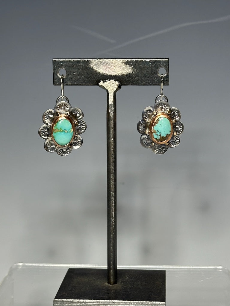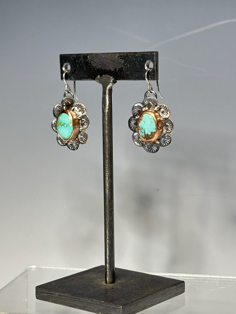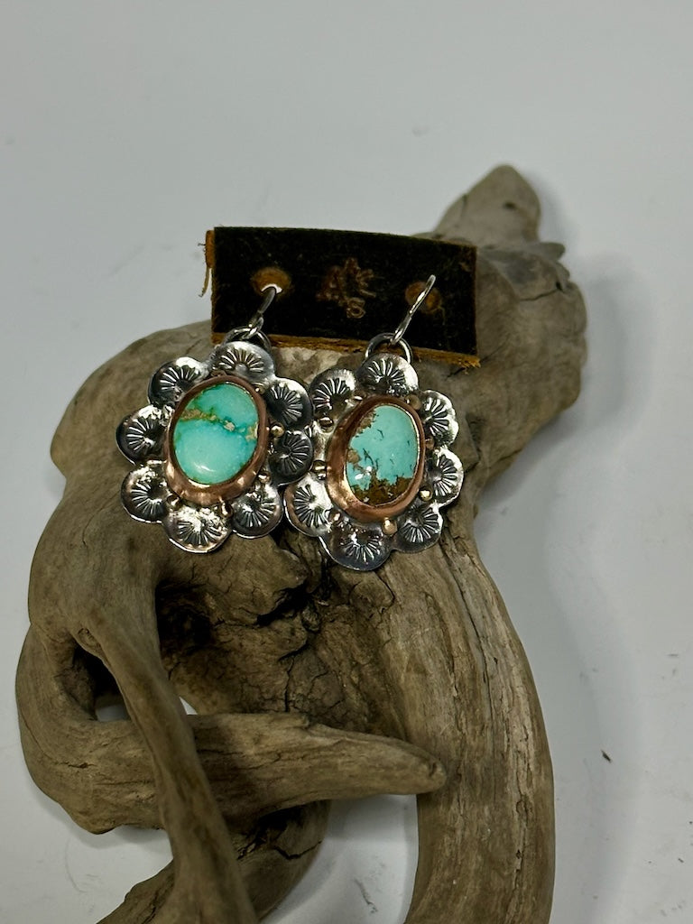 High grade Royston turquoise mined by the Otteson family in Nevada. Set in copper on sterling silver. Hand stamped Native shell design with brass bead accents.