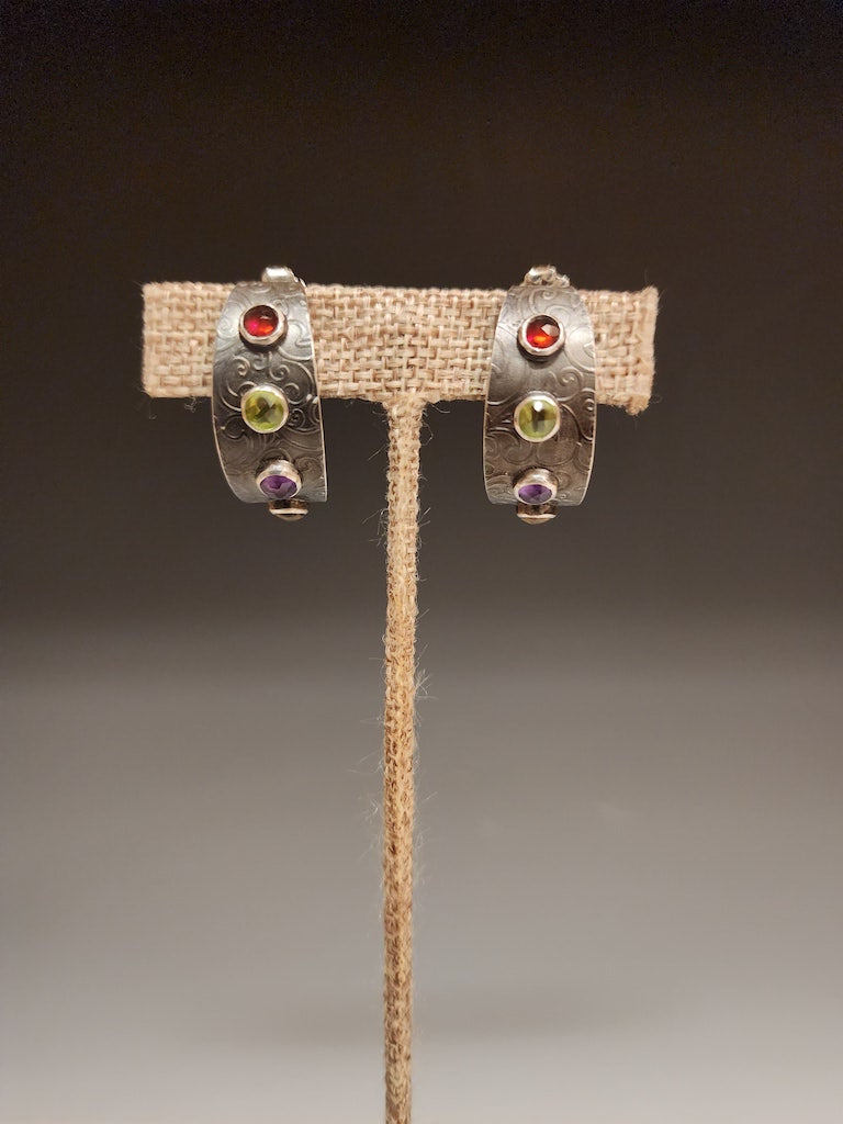 OXIDIZED HOOP EARRINGS WITH GARNET, PERIDOT, AMETHYST AND CITIRINE