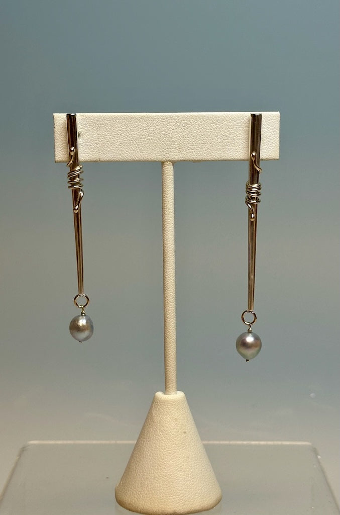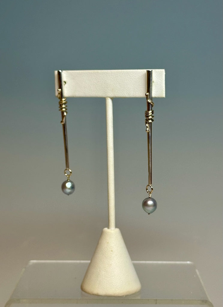 ASYMMETRICAL STERLING SILVER WITH 14K GOLD WRAP AND BLUE PEARL EARRINGS MB194