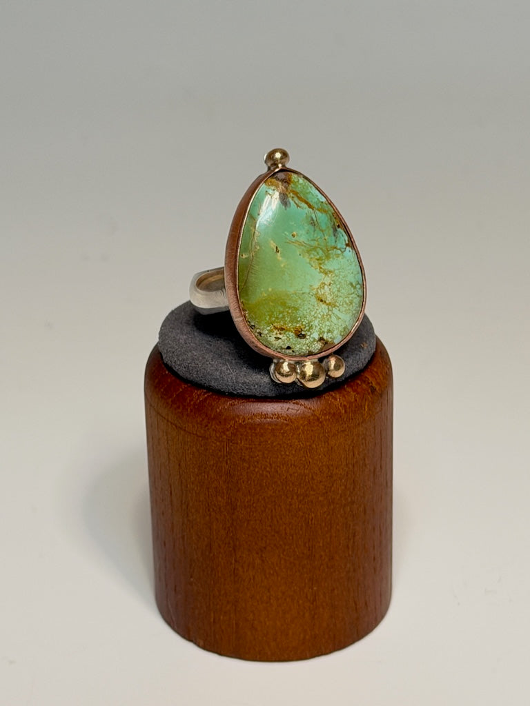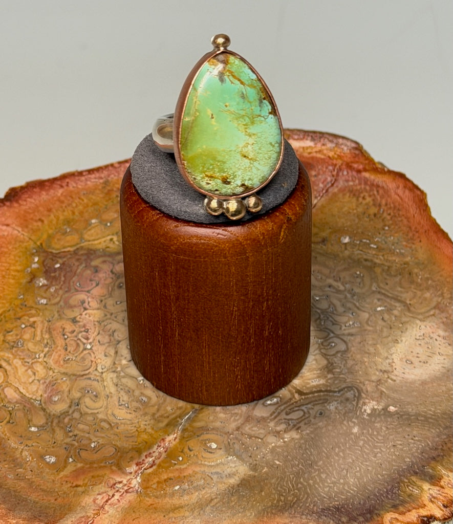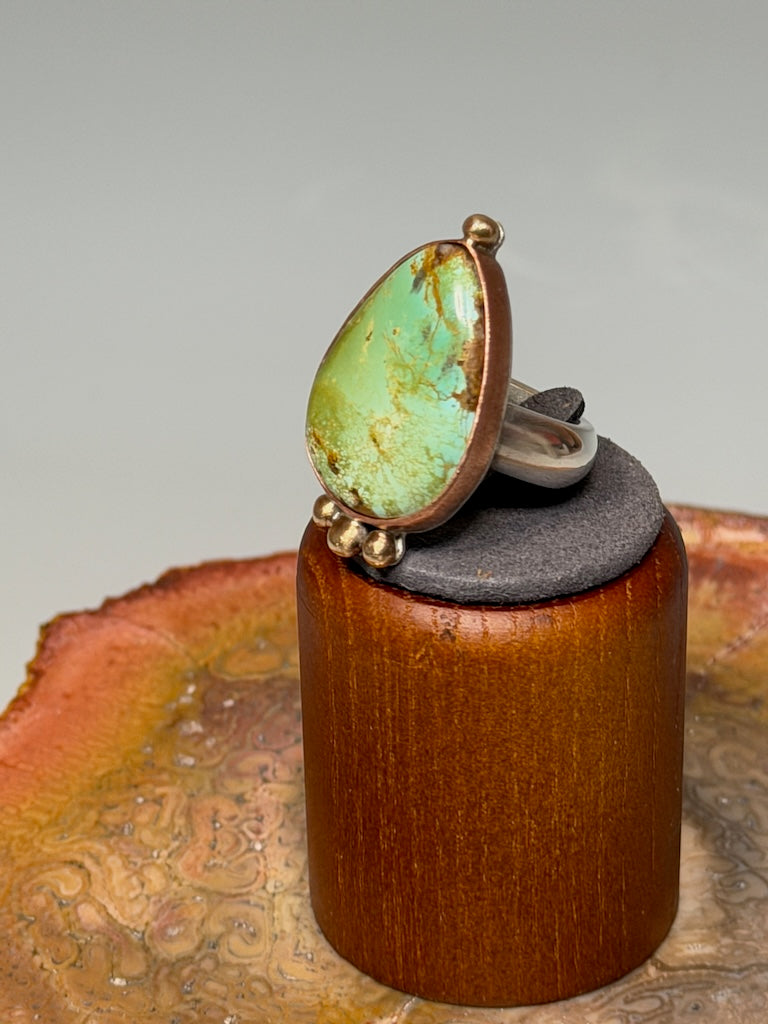 Royston turquoise that has been mined in Nevada. Set in copper with brass bead accents. Hand forged, heavy gauge sterling silver shank. Brushed and polished.