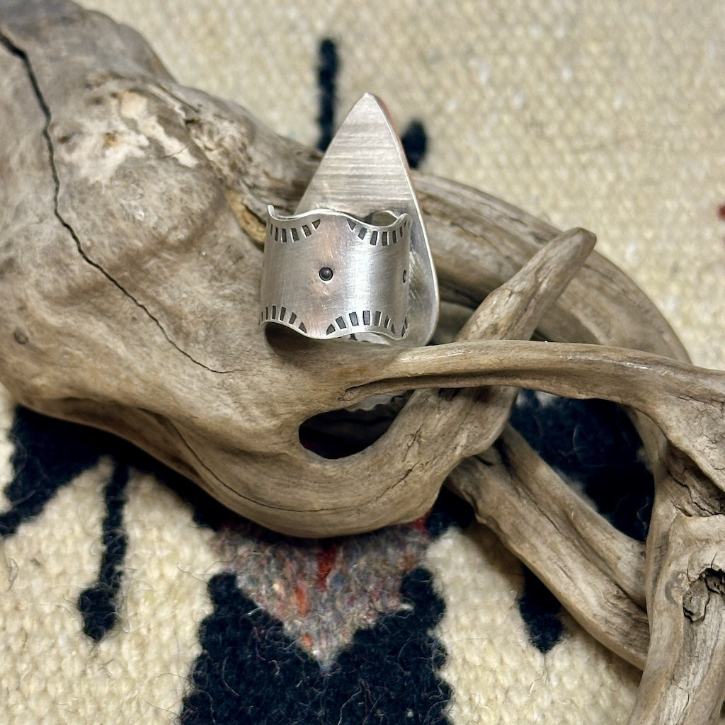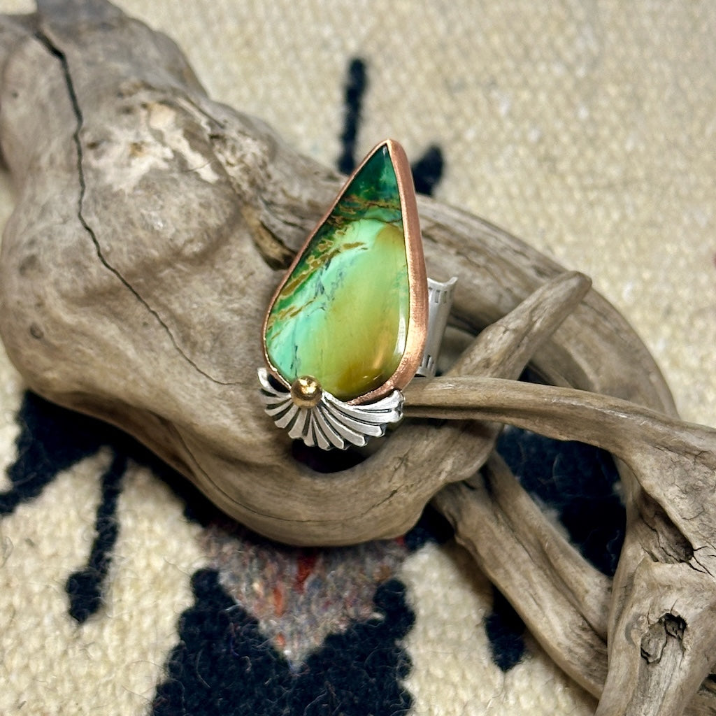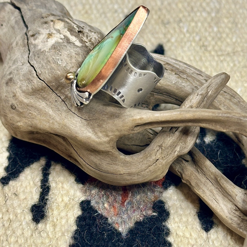 Crescent Lake variscite that is mined from the famous Silk Road area between Tibet and Mongolia. Set in copper on sterling silver. Sterling silver Native fan with a brass bead accent. Hand sawn and hand stamped sterling silver shank. Antiqued, brushed and polished.
