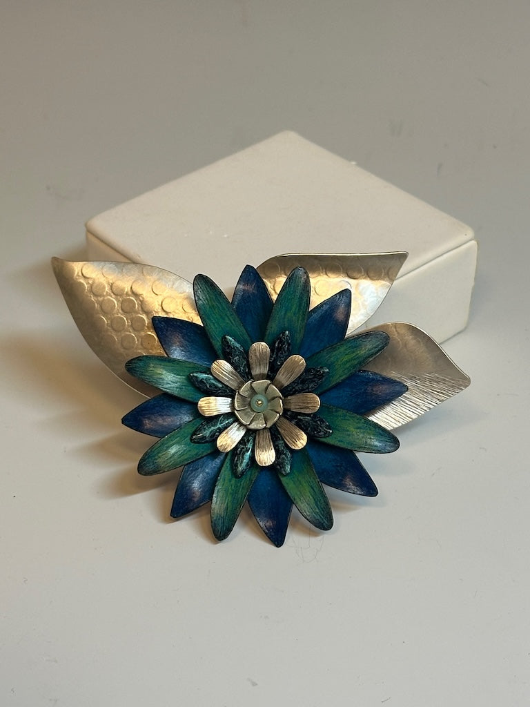 TEAL AND BLUE 5 LAYER FLOWER WITH SILVER LEAVES AND GLASS BEADS PIN/PENDANT DKA236