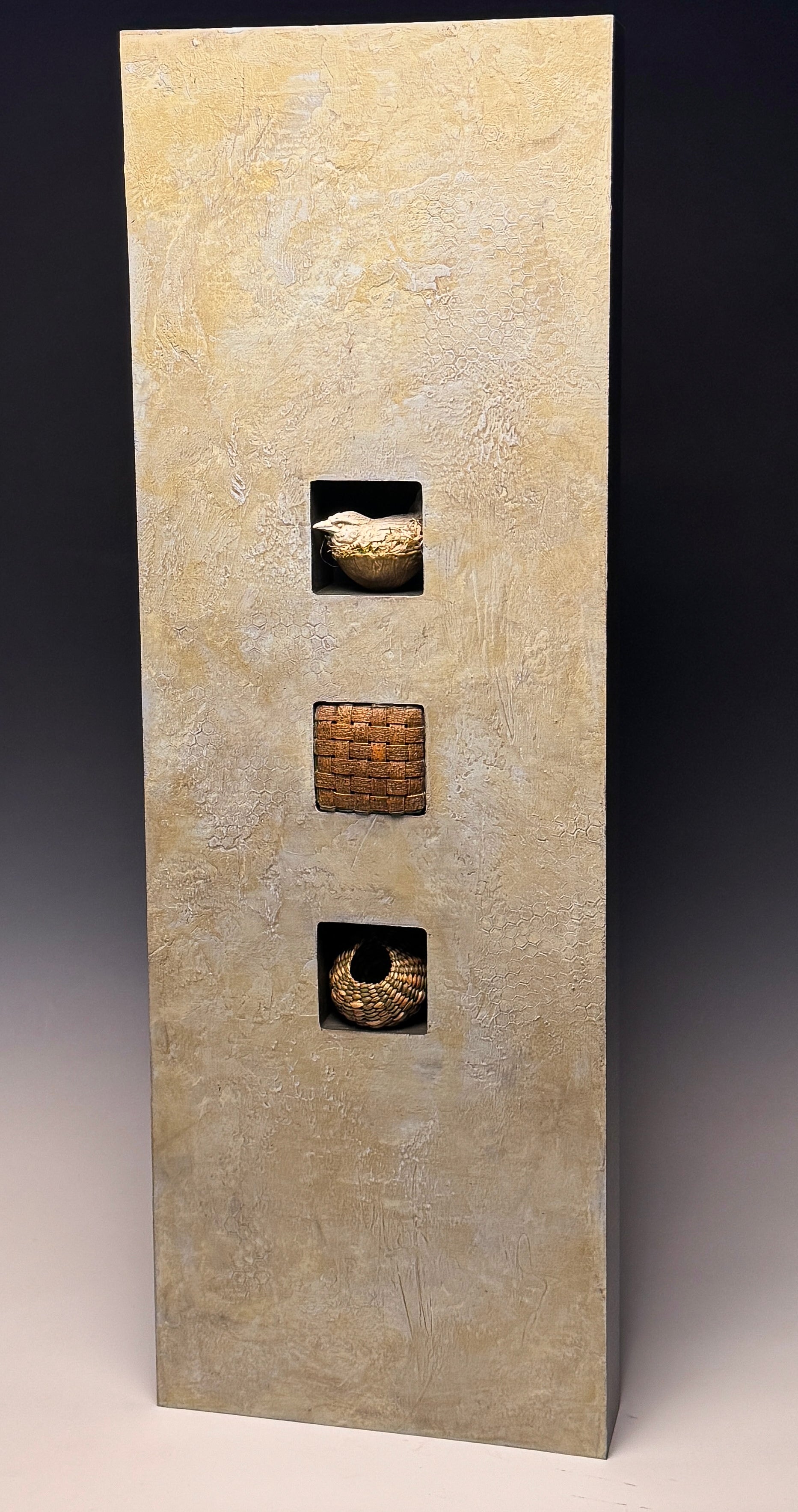 Kudzu, poplar bark, paperclay, iris foliage, mimosa bark, encaustic wax, cold wax, oil paint, poplar